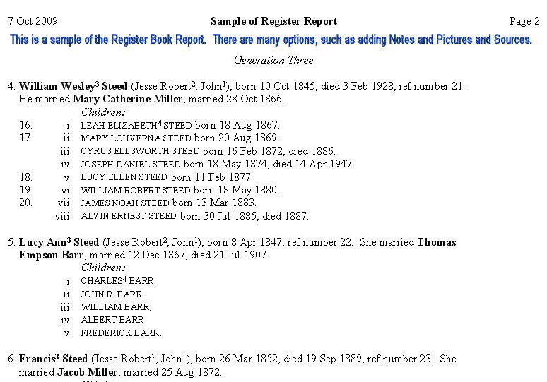 Here are some sample printed reports in JPG picture format that you can view. After you view the report, press the Back button on your browser to return here. If you have Adobe Acrobat loaded on your computer, then see the reports at the bottom of this page which have more detail. These samples were reduced a little to help fit them on your screen. Brother's Keeper prints over 25 different charts and reports, and each report has several options. So the list below is just a sample of one way to print some of the reports.